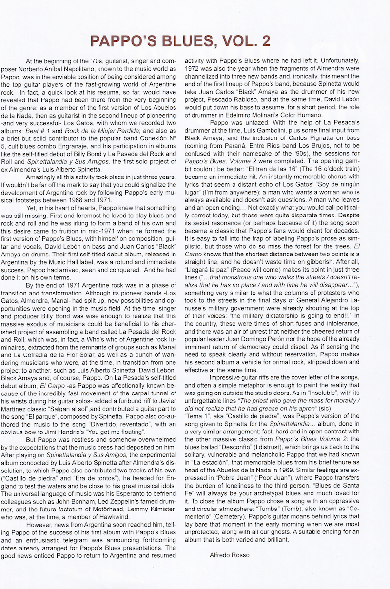 On this album guitarist Norberto “Pappo” Napolitano established a style with influences of hard rock, blues rock and acid rock, adapting the power trio scheme inaugurated by Cream and Jimi Hendrix Experience to an urban sensibility that integrated naturally into rock of the early 70s. Featuring eight songs all composed by Pappo with each track showing the genius of him as a composer, performer and guitarist, filled with memorable riffs and solos, as well as a lyrical sensitivity that reflects his image as a Buenos Aires’ guitar hero.